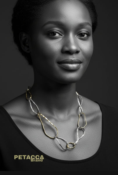 La Catena Asimmetrica realizzata interamente a mano in argento 925 nichel free - è una composizione di maglie di varie misure martellate e bicolore, la lunghezza è di 65 cm.