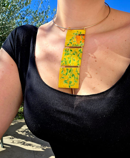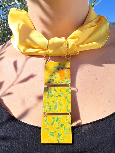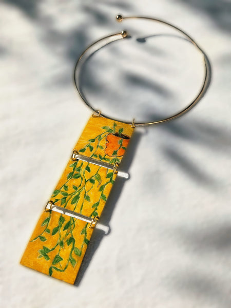 Indossare l'arte è possibile grazie a Petaccabrand, 3 mini quadretti in legno dipinti a mano creano una continuità di foglie che sposano con il colore del sole, giallo luminoso, di rinascita, di Primavera.