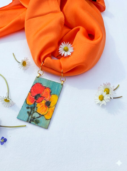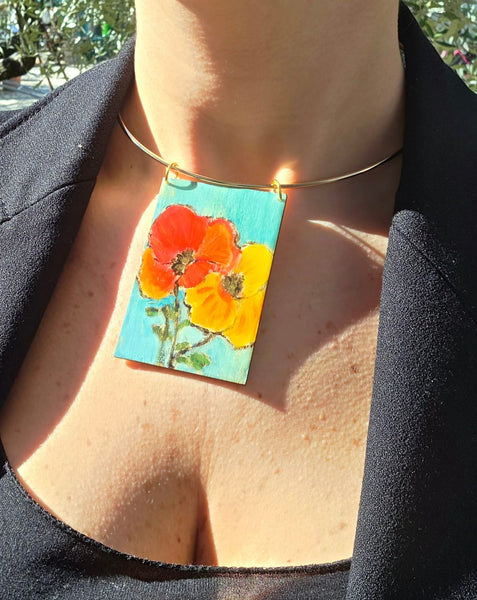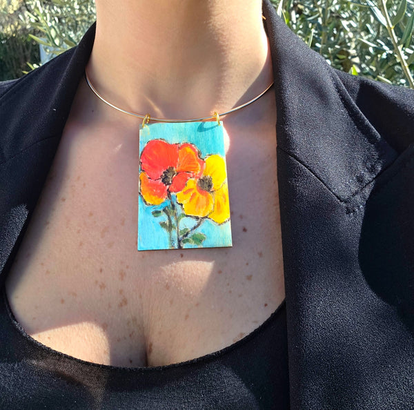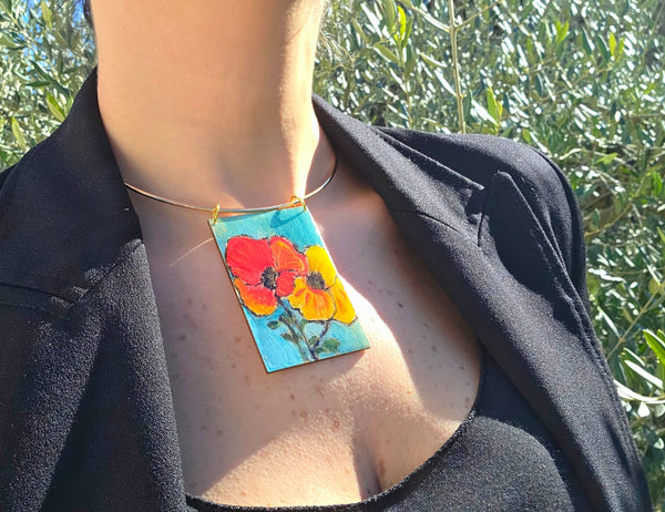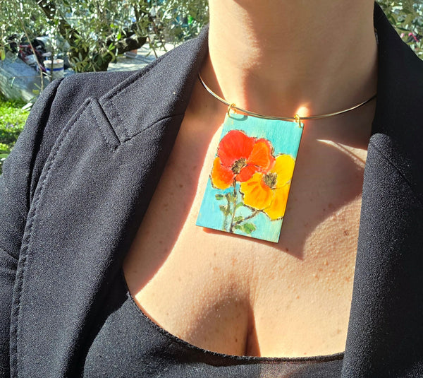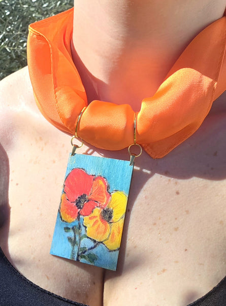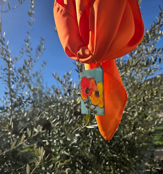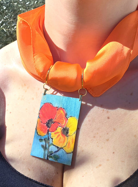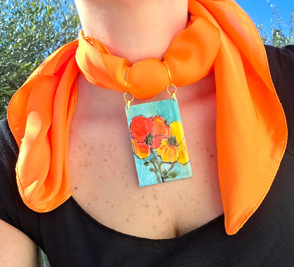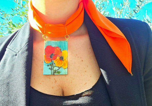 Dimensioni: quadretto in legno 7,5 cm x 5 cm, Foulard 70 cm x 70 cm, Choker regolabile.