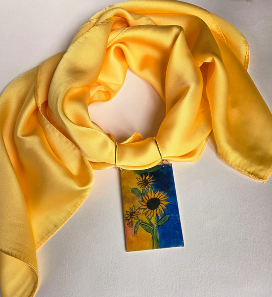 Dimensioni: quadretto in legno 7,5 cm x 5 cm, Foulard 70 cm x 70 cm, Choker regolabile.